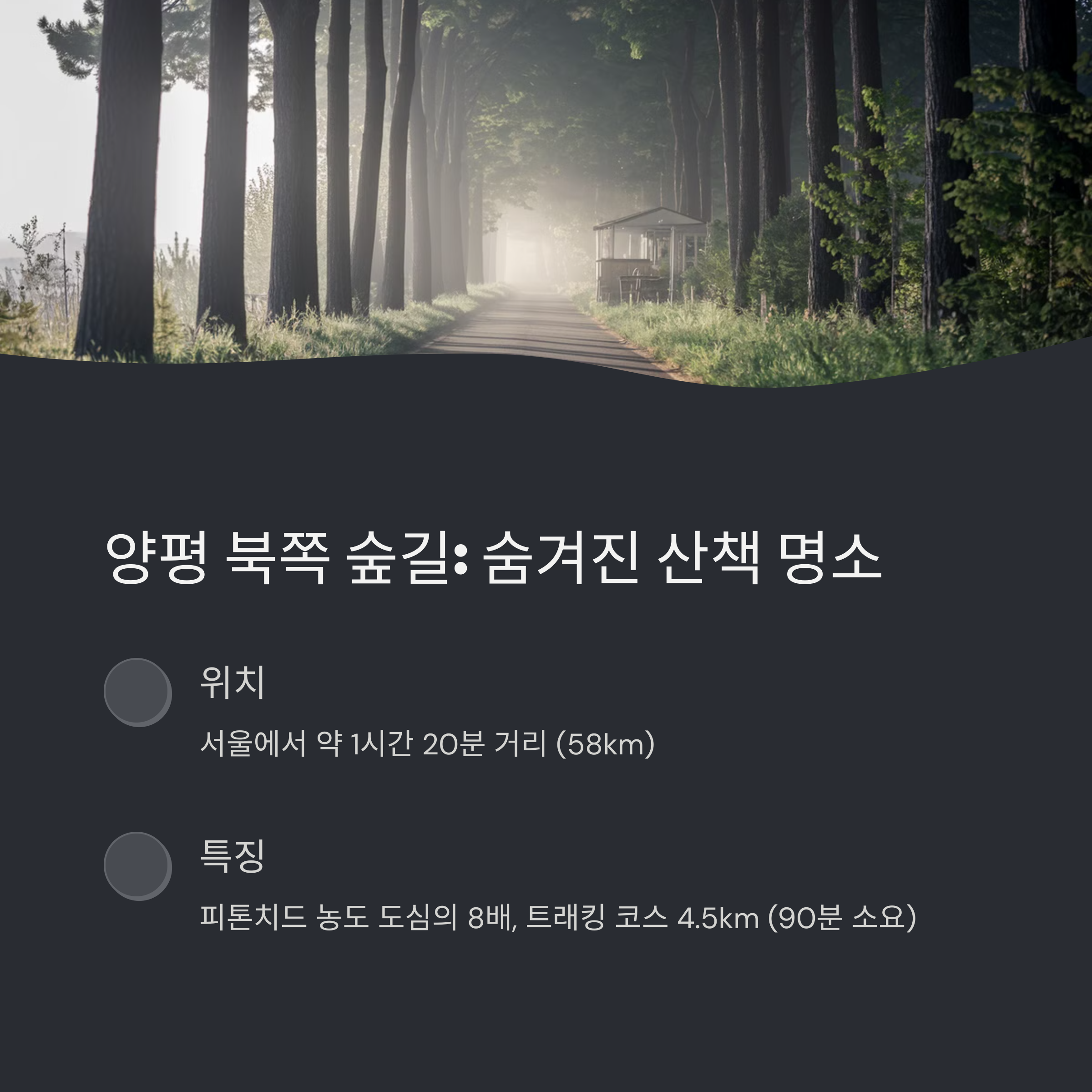 두 번째는 양평 북쪽의 한적한 산길입니다. 알려지지 않아 더욱 특별한 이곳은 조용한 산책로와 자연광이 어우러진 감성 공간입니다. 소나무 숲 사이로 부드러운 햇살이 비치고 작은 북스테이나 카페가 곳곳에 숨어 있습니다. 이곳에서는 특별히 뭘 하지 않아도 좋습니다. 창가에 앉아 책을 읽으며 계절의 소리에 집중해보세요. 진정한 힐링이 무엇인지 느끼게 될 것입니다.
